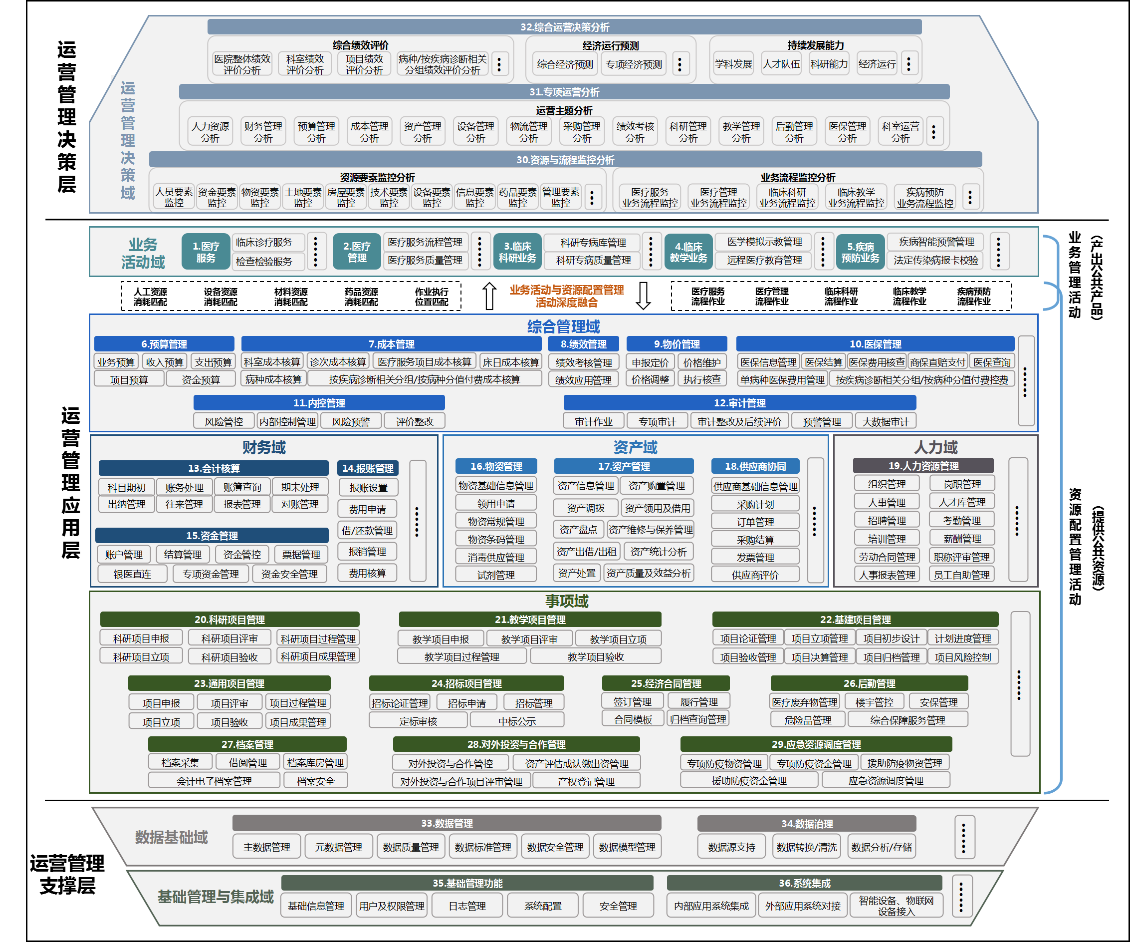 本指引主要針對公立醫院運營(yíng)管理信息化的整體功能,從原來(lái)的醫院運營(yíng)管理信息化傳統的人財物擴充等更加廣泛,包括了分為醫教研防業(yè)務(wù)活動(dòng)、綜合管理、財務(wù)、資產(chǎn)、人力、事項、運營(yíng)管理決策、數據基礎、基礎管理與集成9大類(lèi)業(yè)務(wù),對45163個(gè)功能點(diǎn)進(jìn)行功能設計。